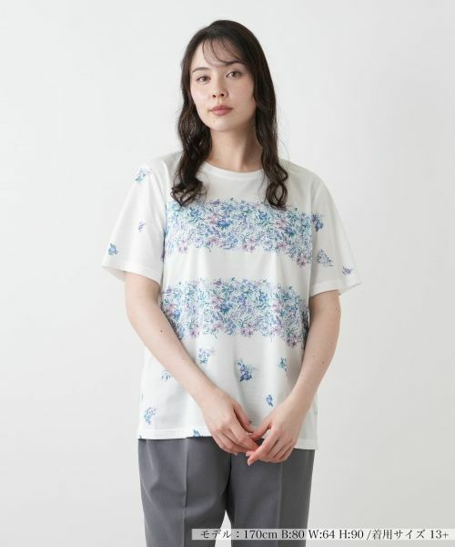 彩り豊かなフラワープリントをボーダー状にあしらい、華やかさと品のよさを兼ね備えたクルーネックカットソー。繊細な花々が優しい表情を添え、シンプルながらも印象的なデザインに。柔らかな肌触りのコットン生地を使用し、快適な着心地を実現。すっきりとしたシルエットはボトムスともバランスよく調和し、スタイルを選ばず活躍します。一枚でさらりと着こなすのはもちろん、ジャケットやカーディガンのインナーとしてもおすすめ。