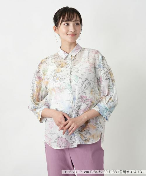 世界地図のプリントが淡くにじむ水彩のような色合いで描かれた、アンティーク調のブラウス。軽やかなクロップドスリーブと裾に丸みをもたせたラウンドカットヘムが、動きのあるスタイリングを演出。リラックス感のある着心地ながらもきちんと感はキープ。さらりと肌に心地よいコットン素材を使用しているのでこれからのシーズンにぴったり。バックネック下には、さりげなくロゴ入りのプレートがあしらわれています。