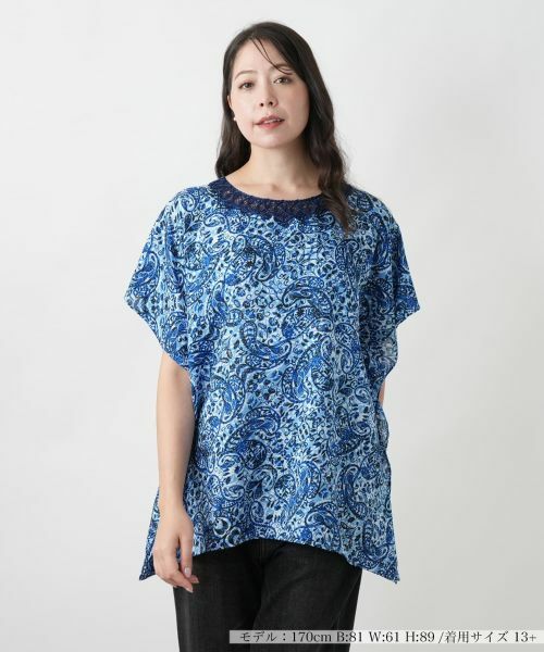オリエンタル調のペイズリー柄が奥行きと華やぎを添えるブラウス。ネックラインには透け感のあるレース刺繍をあしらい、涼やかでフェミニンなエッセンスに。肩をやさしく覆うスリーブは、風をはらむようなふんわりとしたフォルムで程よい抜け感とリラックス感を演出。一枚で主役になる存在感がありながらも着心地は軽やか。パンツにもスカートにも合わせやすく、夏のスタイリングに映えるトップスです。バックネックの涙あきはボタン開閉が可能。