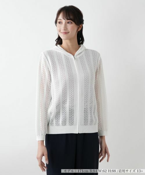 レーシーな透かし編みで仕上げた、フード付きジップカーディガン。繊細な編み地が風を通し、ほんのりと肌見せを叶えて爽やかな佇まいに。これからの暑い季節にもさらりと快適に羽織れる一枚です。コンパクトなサイズ感のフードは、カジュアルすぎず大人に似合う洗練されたバランス。フロントジップで着脱もスムーズに行え、羽織りアウターとしても着回し力抜群。スカートにもパンツにも合わせやすい着丈なので、幅広いコーディネートで活躍してくれそうです。