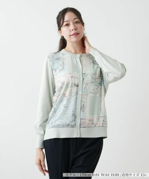 地図をモチーフにしたグラフィックが印象的なクルーネックカーディガン。ヴィンテージライクなプリントがクラシカルな雰囲気を醸し出し、シンプルになりがちなスタイルに遊び心をプラスします。すっきりとしたシルエットで身体に程よくフィットしつつも、動きやすく快適な着心地を実現しています。長すぎず短すぎないベーシックな丈感はスカートにもパンツにもバランスよくマッチし、多彩なボトムスと好相性。