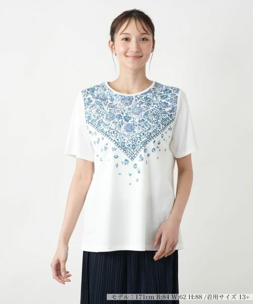 ボタニカルスカーフの華やかなグラフィックをプリントで落とし込んだカットソー。繊細な模様が上品なアクセントを添える、シンプルながら存在感のある一枚です。やや薄手のコットン生地を使用しており、すっきりとしたシルエットでデザインしました。デニムやワイドパンツと合わせてカジュアルに、ロングスカートでまとめれば大人フェミニンなスタイリングに。ジャケットのインナーとしても映え、多彩なコーディネートで活躍するアイテムです。