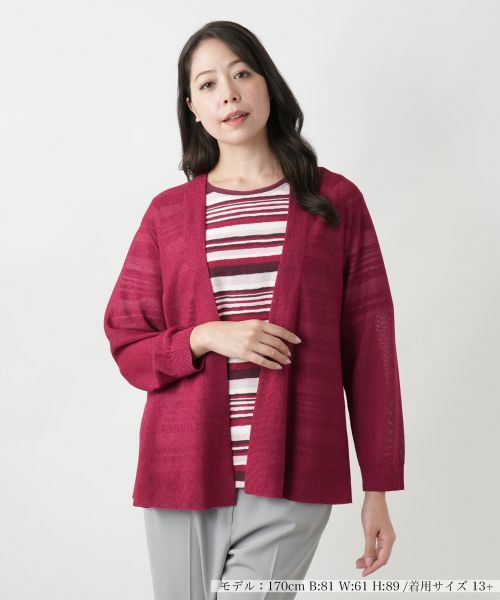 さらりと羽織るだけで上級者らしいコーディネートが完成するトッパーカーディガン。ほんのりと透ける繊細な編地が春夏らしい軽やかさを演出。通気性に優れたニットは肌にまとわりつかず、暑い季節にも快適な着心地を叶えてくれます。フロントはボタンレスで仕立て、縦のラインをすっきり強調するデザインに。Tシャツやブラウスにさらっと重ねるだけで、気負わないレイヤードスタイルが簡単に完成します。