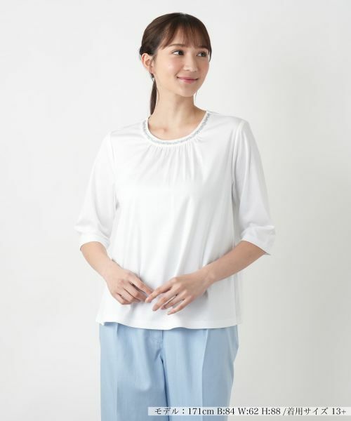 大人の女性らしいエレガントな雰囲気を纏う、クロップドスリーブのカットソー。ネックラインにさりげなく煌めくスパンコールをあしらい、リュクスなアクセントをプラス。フロントにはギャザーを施し、柔らかなニュアンスに。すっきりとしたシルエットで合わせるボトムスを選ばず、カジュアルからきれいめまで幅広いスタイリングに対応する一枚です。バックネックの涙あきはボタン開閉が可能。