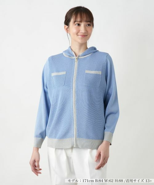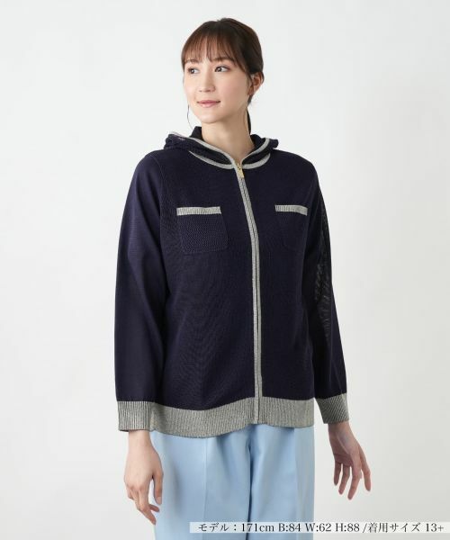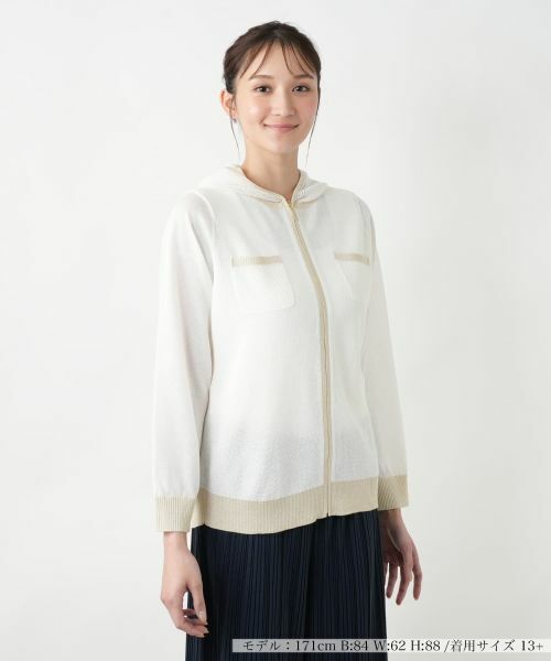 柔らかな温もりに包まれる、エレガントな佇まいのニットパーカ。シンプルな中にもラメが煌めく配色ラインをあしらい、さりげない華やかさをプラス。フロントはファスナー仕様でスムーズな着脱が叶い、さっと羽織れる手軽さも魅力です。バックスタイルには編地を切り替えたビッグフードを施し、後ろ姿まで印象的なルックスに。カジュアルながらも上品な仕上がりで、きれいめなコーディネートにも溶け込む一枚です。