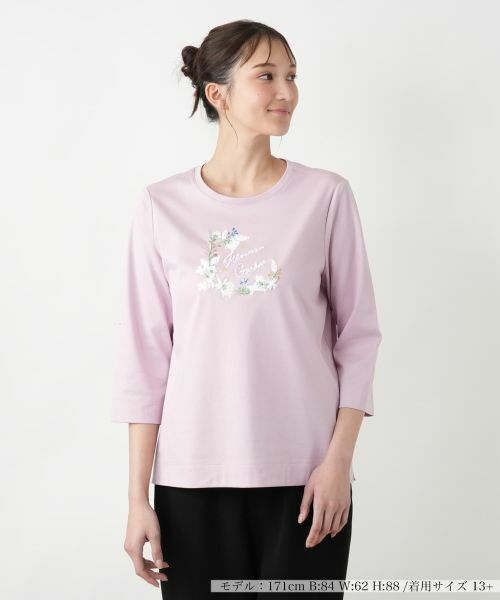 立体感のある手の込んだフラワー刺繍が目を惹く、季節感溢れるデザインのクルーネックTシャツ。柔らかなコットン生地を使用しており、肌触りがよく、一日中快適に着られるのも嬉しいポイント。すっきりとしたシルエットでボトムスを選ばず、バランスよくコーディネートしやすい一枚です。デニムと合わせてカジュアルに、スカートでまとめてフェミニンにと、幅広いスタイルで活躍する使い勝手のよいアイテムです。