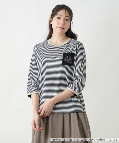 これからの季節にぴったりなクロップドスリーブのクルーネックトップ。爽やかなテイストのボーダーも相俟って、大人のカジュアルスタイルに程よい抜け感をプラスします。身頃は柔らかな肌触りのコットン素材を使用し、快適な着心地を実現。すっきりとしたシルエットでボトムスともバランスよくマッチするのが魅力です。ネックラインや袖口のリブ部分にラメを施し、左胸にはさりげなくロゴ刺繍をあしらったポケットをレイアウトし、絶妙なバランスのアクセントをプラスしています。