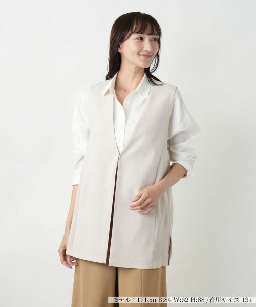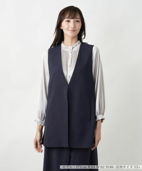身体のラインに沿うようなIラインシルエットのVネックベスト。縦の印象を強調し、すっきりとした佇まいを演出します。フロントホック仕様でミニマルに仕上げ、余計な装飾を省いたことでシャープで洗練された印象に。裾にはサイドスリットを施し抜け感をプラス。さりげなく軽さを出しつつ、動きに合わせて美しいシルエットが生まれます。前ウエスト両サイドにはスリットポケットをレイアウト。ヒップを自然にカバーするやや長めの丈感で全体のバランスもスマートに整えます。