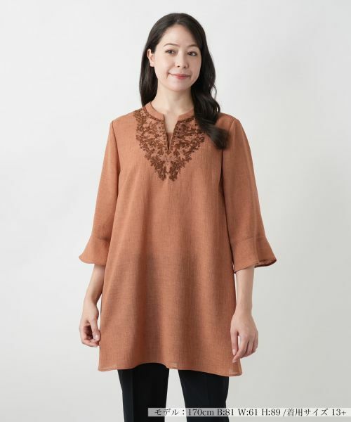 程よい抜け感を演出するキーネックで仕上げた、季節らしい軽やかなニュアンスのチュニックブラウス。さらりとした肌離れのよい生地に、ネックラインを彩る立体的なボタニカル刺繍が表情を添える一枚。クロップドスリーブの袖口はふわりと広がるフレアシルエットで華やかさをプラス。パンツやレギンスといったシンプルなボトムと合わせるだけで、上品なリゾートムードが漂うスタイリングが完成します。胸元のスナップボタンにより開閉が可能。