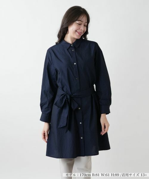 国内桐生産地の素材を使用したシャツカラーのロングブラウス。織り組織を変えてボーダー柄を表現しています。生地に凹凸感があり、立体的で適度なハリを持たせています。また軽量感があり通気性が良い点も特長です。共布ベルト付きなので、合わせるボトム次第で着こなしがお楽しみいただけます。