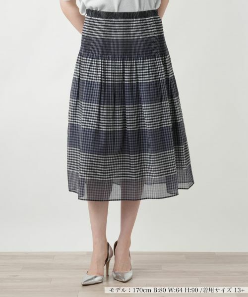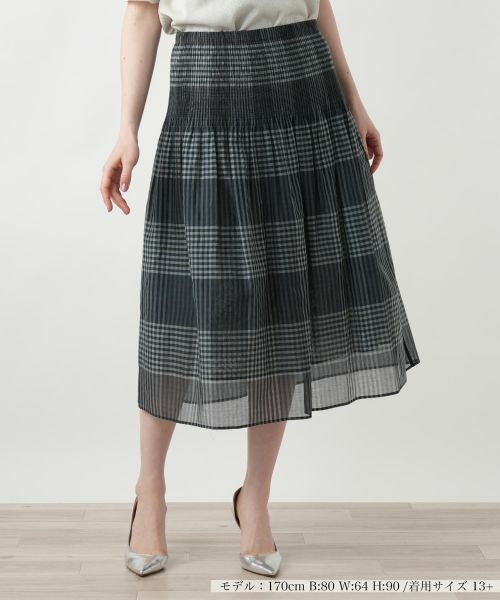 繊細なチェック柄をのせたシアー素材が、軽やかに揺れるミモレ丈のフレアスカート。歩くたびにふわりと広がるシルエットが上品な華やぎを添えます。ウエストは総ゴム仕様で締め付け感なくフィットし、デイリーユースでも快適。トップスをタックインすれば、ウエストラインをすっきり見せてスタイルアップ見せも叶います。シンプルに合わせるだけで、着こなしにほどよい存在感を与えてくれる一枚です。