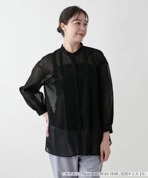 シアーなコットン素材が軽やかな印象を与えるバンドカラー比翼ブラウス。巧妙なバランスでタックを寄せ、ふんわりとしたフォルムを演出。ドロップショルダーが肩ラインを柔らかく見せ、リラックス感のあるシルエットを生み出しています。ワイドパンツと合わせれば洗練されたモードな着こなしに、フレアスカートでまとめればフェミニンなニュアンスに仕上がります。羽織りとしても活躍し、幅広いコーディネートが楽しめる一枚です。