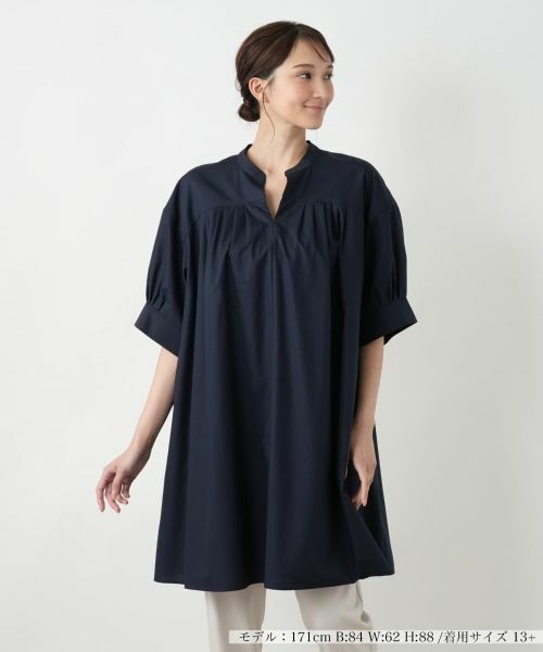 スキッパーネックが絶妙な抜け感を演出するバルーンブラウス。ギャザーをたっぷりと寄せたデザインが、ふんわりとしたシルエットを生み出します。ゆったりとしたフォルムが体型をさりげなくカバーしつつ、軽やかな印象に。ナチュラルな風合いのコットン生地を使用し、さらりとした快適な着心地を叶えました。スリムなパンツと合わせればメリハリのあるバランスに、ワイドパンツやロングスカートでまとめればリラックス感のあるスタイリングに仕上がります。