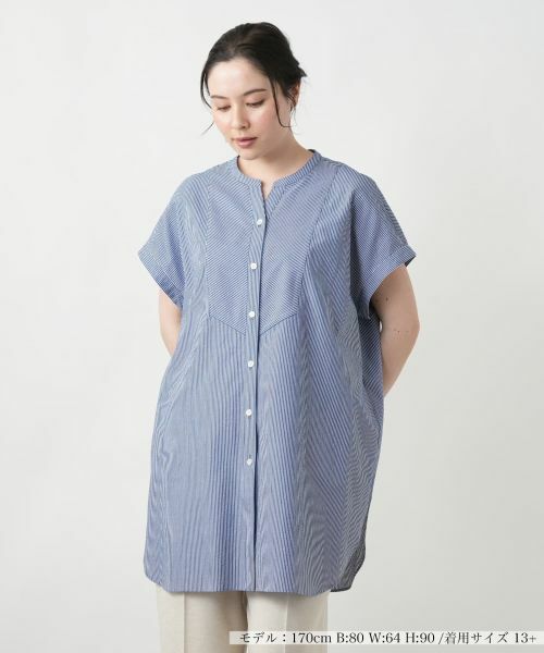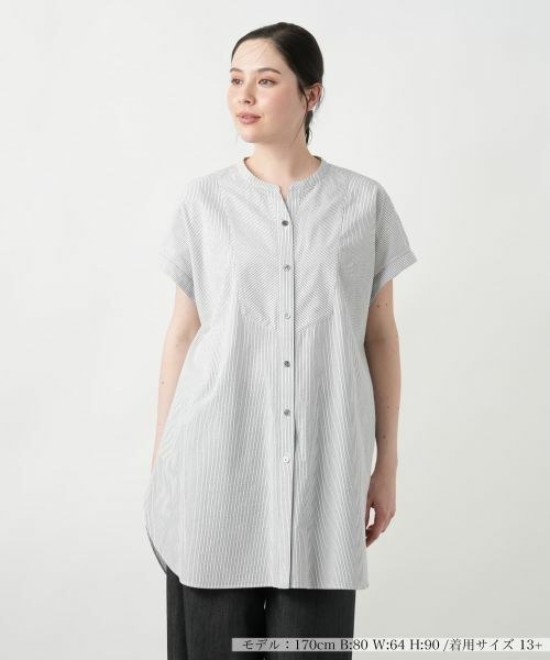 細いストライプのリップル生地を使用した、シーズンムードを呼び込むスキッパーブラウス。フロントのボザム切り替えでストライプの向きを巧みに変えることで、視線を惹きつける繊細なニュアンスをプラス。バックスタイルにはタックを施して立体感のあるシルエットに。裾はラウンドカットで軽やかに仕上げられ、やわらかなコクーン感を生み出しています。季節らしい抜け感と爽やかさを持つ、大人のための一枚です。