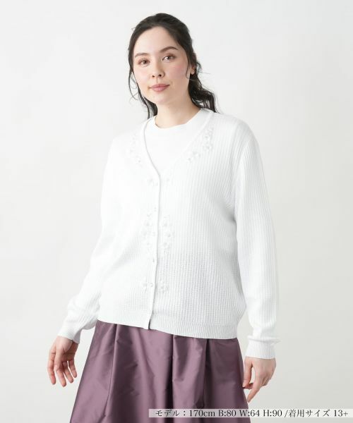 フロントにデコラティブなフラワー刺繍やビジューボタンを施した、存在感のあるVネックカーディガン。ラメの煌めきも上品なアクセントとなり、コーディネートにさりげない華やかさを添える一枚。コットンとレーヨンをブレンドし、軽やかな透かし編みで仕立てることで涼やかな風合いを実現しました。ゆったりと開いたVネックが顔周りをすっきりと見せつつ、絶妙な抜け感を演出。羽織るだけでこなれた雰囲気をプラスしてくれる、これからの季節の装いにぴったりの一枚です。