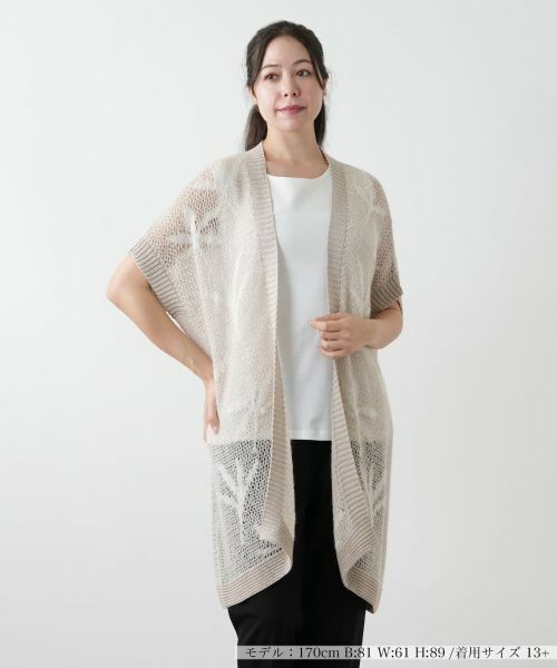 スパンコールが煌めくリーフ柄が印象的なニットベスト。ざっくりと編まれた風合いがナチュラルな抜け感を生み出し、程よいルーズさのあるシルエットが大人のリラックスムードを演出。肩周りを優しく覆うワイドなショルダーラインが特徴で、さっと羽織るだけでこなれ感のある着こなしに。気になるボディラインをカバーしつつ、縦長のシルエットがスタイルアップ見せ効果も叶えます。フロントはノーボタン仕様ですっきりとしたデザインに仕上げており、インナーとのレイヤードも楽しめます。