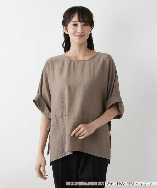 リラックスしたムードをまとわせるオーバーサイズブラウス。シワ感のある涼やかなファブリックを用い、軽やかな着心地と季節感を演出。ネックラインはすっきりと開き、折り返し仕立ての袖口や、裾に入れた深めのスリットがナチュラルな抜け感をプラス。ウエストにはドローストリングが施され、ギャザーの寄せ方でシルエットの調整が可能。バックネックの涙あきはさりげない後ろ姿のアクセントに。一枚でさらりと着映えし、日常にも休日スタイルにも寄り添うトップスです。