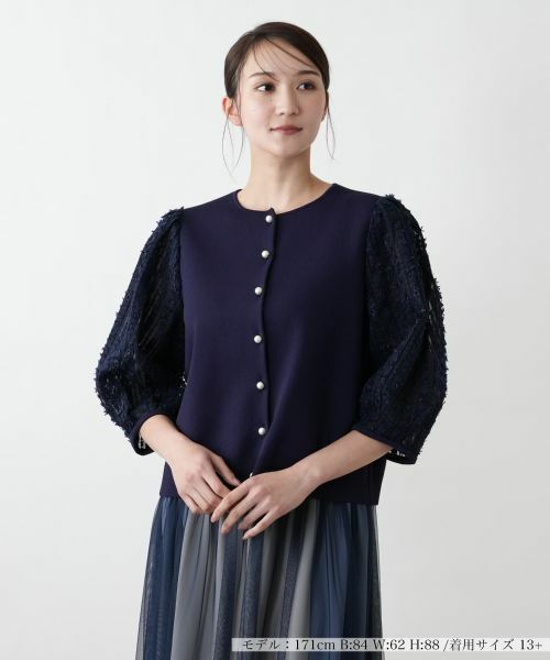 透け感のある素材で切り替えたボリュームスリーブが涼やかな印象を与えるショート丈のカーディガン。コンパクトなシルエットはハイウエストボトムやワンピースとの相性抜群。フロントにはパール調のボタンをあしらい、クラシカルかつ上品なアクセントを添えています。シンプルながらもディテールにこだわったデザインで、羽織るだけで華やかな着こなしが完成します。