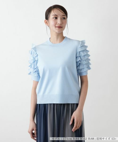 袖のティアードフリルがフェミニンな華やかさを添える、ハイネックニットプルオーバー。高さのあるネックラインが気になるデコルテをさりげなくカバーしつつ、上品な佇まいを演出。すっきりとしたシルエットでボトムスを選ばず、タックイン・アウトどちらのスタイルも楽しめます。デニムと合わせてカジュアルダウンしたり、ロングスカートでエレガントにまとめる着こなしもおすすめ。一枚で主役級の存在感を放ちながらも、さまざまなシーンにマッチする着回し力の高いトップスです。