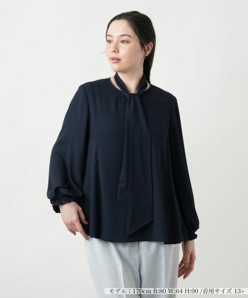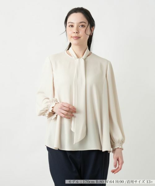 ボリューム感のあるボウタイが軽やかに揺れる、シーズンムードたっぷりのブラウス。身頃にはほどよくゆとりを持たせ、袖にはギャザーを寄せて、リラクシーなシルエットを構築。バックネックには涙あきを施し、上品な肌見せとともに、ボタン開閉が可能なデザインに。パンツと合わせればきりっとシャープな印象に仕上がり、ロングスカートでまとめれば優美な雰囲気のスタイリングが完成します。袖口はゴムシャーリングで心地よくフィット。オンにもオフにも映える、使い勝手のよいトップスです。