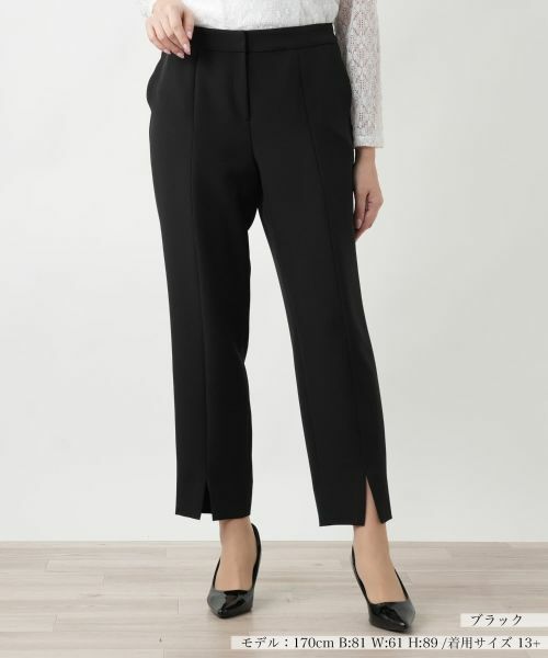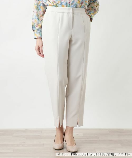 フロント裾に施されたスリットが抜け感をプラスし、足元を軽やかに演出します。ウエストはすっきりとしたデザインながらも、快適な着心地を叶える仕様に。伸縮性のある素材で、動きやすくデイリーに活躍してくれます。ブラウスやニットと合わせれば、上品なスタイルの完成。カジュアルなトップスと合わせても洗練された印象に仕上がるので、ワードローブに一枚あると便利なアイテムです。フロントはスナップボタン&ホック、ファスナーで開閉が可能。