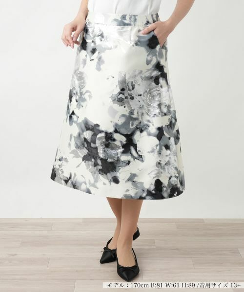 濃淡のあるフラワー柄が美しく映える、エレガントなミディ丈スカート。ラメの煌めきをさりげなく散りばめることで上品な輝きをプラス。華やかさの中にシックな表情を宿したデザインで動くたびに繊細なニュアンスが際立ちます。ウエストは程よくシェイプされ、女性らしいメリハリのあるシルエットに。裾に向かってふわりと広がるフレア感がフェミニンなムードを引き立てます。歩くたびに揺れるシルエットが優雅さをプラスし、スタイル全体を軽やかに見せてくれる一枚です。バックはホック&ファスナーにより開閉が可能。
