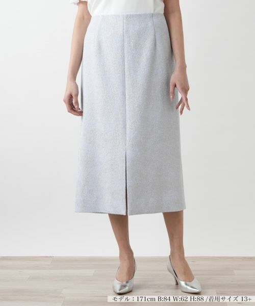ラメが繊細に煌めく素材を使用し、上品な華やかさを演出したミモレ丈のタイトスカート。フロントには深めのスリットを施し、動きやすさとともに、大人の余裕を感じさせる絶妙な抜け感をプラス。バックウエストはゴム仕様になっており、心地よいフィット感と快適な着用感を実現しました。単品使いでブラウスやニットと合わせれば、上品かつエレガントスタイルに。フォーマルから週末のおでかけまで多彩なシーンで活躍する一枚。同素材のジャケットとセットアップでコーディネートするのもおすすめです。