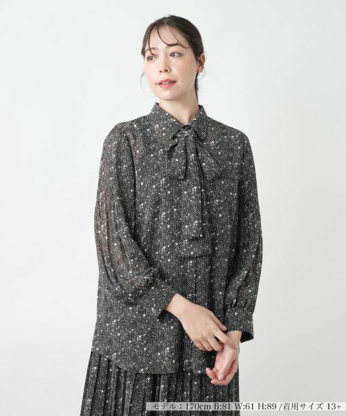大小のドットが重なり合い、奥行きのある表情を生み出すボウタイブラウス。襟元には存在感たっぷりのボウタイがあしらわれ、華やかさを感じさせるエッセンスに。ふんわりと膨らむボリュームスリーブが、優しげで女性らしい雰囲気をプラス。袖口はすっきりと絞り込むことでメリハリをつけ、フェミニンムードと上品さを両立したシルエットに。パンツと合わせればシックな大人のスタイルに、スカートとのコーディネートでエレガントな装いに。オフィスからお出かけまで幅広いシーンで活躍する一枚です。