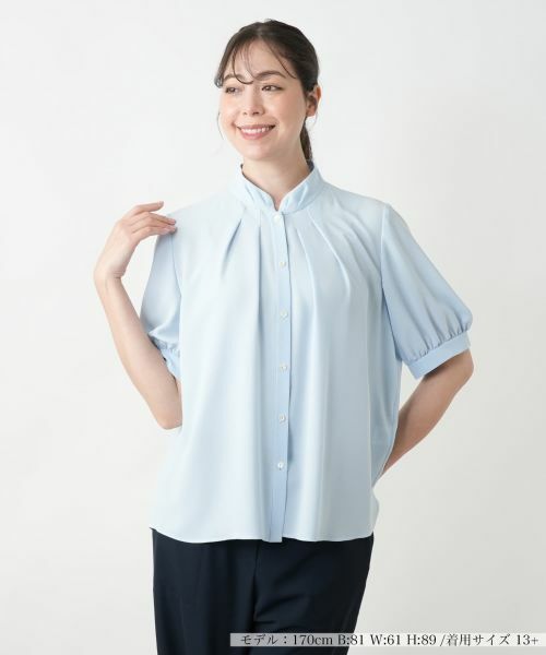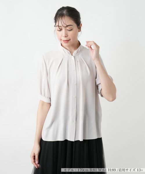 柔らかな表情の薄手の生地を使用したスタンドカラーブラウス。ミニマルなデザインながらも、細部までこだわりを感じさせる一枚。フロントにはタックを施し、程よい立体感を演出。身体のラインを拾いすぎず、さりげなく美しいドレープを生み出します。袖には適度なボリューム感を持たせ、ふんわりとした優しいニュアンスをプラス。カフス部分をすっきりとまとめることで、甘さを抑えつつ上品な印象に仕上げました。オンオフ問わず活躍し、多彩なシーンで着回せそうなトップスです。