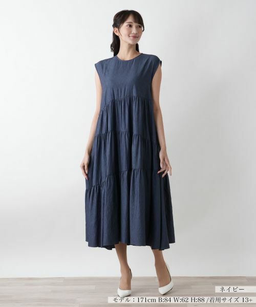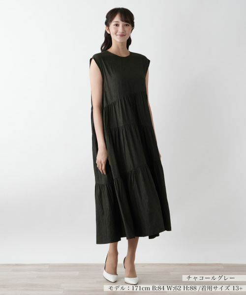 軽やかな素材感と、分量感たっぷりのティアードデザインが魅力のワンピース。動くたびに揺れるシルエットが柔らかで女性らしい印象に。すっきりとしたノースリーブに、広がりすぎないフレアラインで、大人の可愛らしさを引き立てます。一枚で華やかな存在感がありながらも、落ち着いたカラーが品の良さを演出。カーディガンを羽織れば肌寒い日にも対応可能。休日のお出かけや旅行にもぴったりの、リラックス感あふれる一着です。バックファスナーで開閉が可能です。
