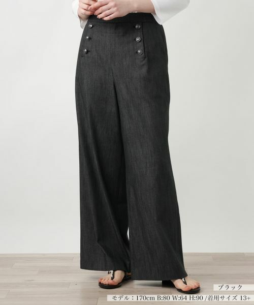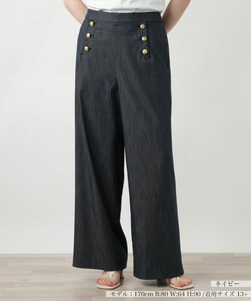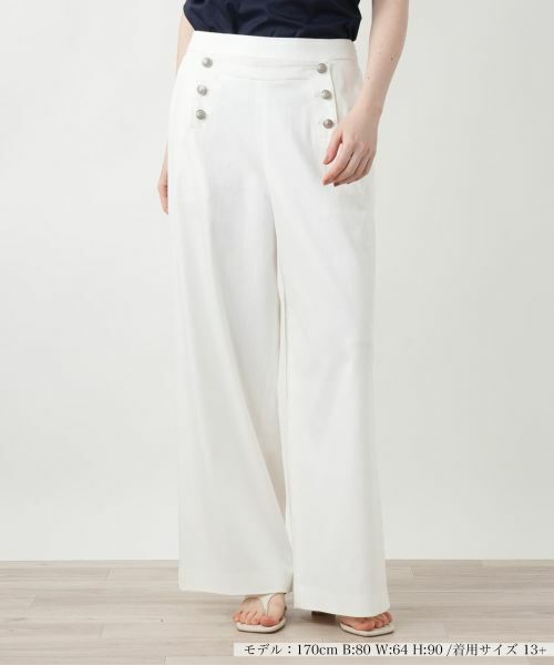 ハイウエスト&ワイドシルエットが美しいバランスを描く、、マリンテイストなデザインが魅力のワイドパンツ。カジュアルな素材ながらも落ち着いたカラーリングで大人の上品さを演出します。フロントのメタルボタンがアクセントとなり、シンプルなトップスと合わせてもスタイリングに華を添えてくれる一着。脚のラインを拾わず、すとんと落ちるシルエットが、歩くたびに動きのある印象に。春夏の軽やかな装いにぴったりな一枚です。フロントは飾りボタンになっており、サイドファスナーで開閉が可能です。