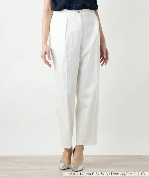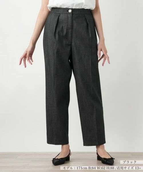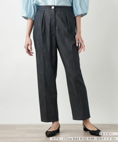 立体的なシルエットを描く、ワンタック入りのテーパードデニムパンツ。程よくゆとりを持たせた腰まわりから、裾にかけてすっきりと絞られたラインが、脚をきれいに見せてくれる一本です。股上はやや深めに設定されており、安心感のあるフィットと抜け感のあるバランスを両立。バックウエストにはゴムを施し、ストレスフリーなはき心地を実現。見た目はきちんと感がありながら、気負わずに過ごせる仕立てが魅力です。シャツやブラウスをインしてもアウトしても様になり、オンにもオフにも頼れる一本です。