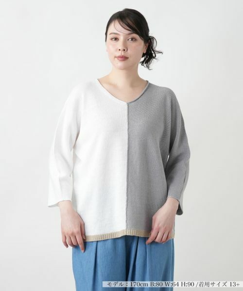 大胆なカラーブロックデザインが目を惹く、新鮮な佇まいのVネックニット。フロント中央で切り替えた配色がインパクトを放ち、コーディネートに遊び心をプラスします。軽やかなクロップドスリーブが抜け感を演出し、腕周りをすっきりと見せてくれるのも嬉しいポイント。麻とコットンをブレンドしたニットは、通気性がよく肌触りも快適。涼やかな風合いが心地よく、これからのシーズンの装いにぴったりの一枚です。