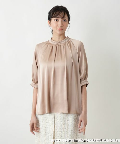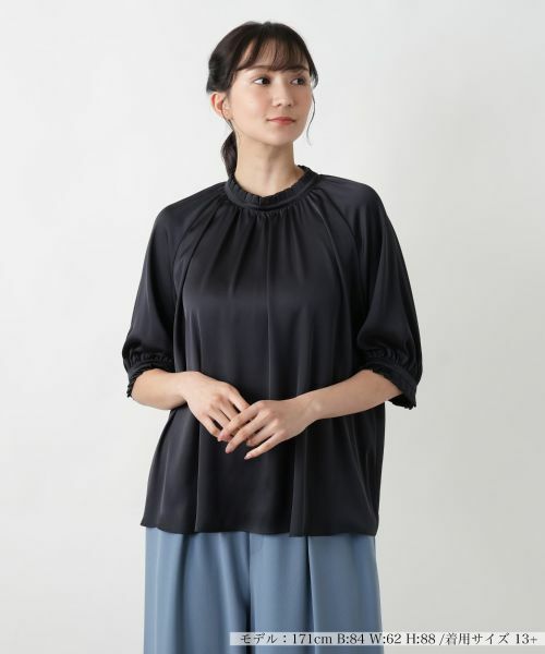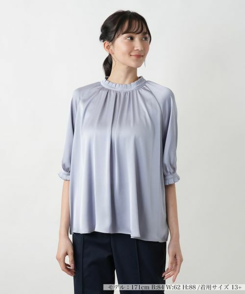 光沢感のある上品な素材が魅力のエレガントなデザインのブラウスです。ハイネックに施された細かいギャザーが、女性らしい柔らかなシルエットを演出。ふんわりとした7分袖は、袖口にギャザーが入っており、さりげないフェミニンさをプラスしています。ゆったりとしたシルエットで、体型カバーしながらも洗練された印象を与えます。オフィスからフォーマルなシーンまで幅広く活躍する一枚で、パンツやスカートと合わせて大人の上品コーデが完成します。