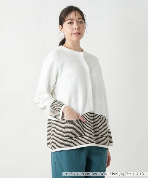 ざっくりと編み込まれた表情豊かな素材感のノーカラーニットジャケット。程よくゆとりを持たせたシルエットが、リラックス感を演出しながらも、上品な佇まいを作り出します。フロントは比翼仕立てですっきりとさせ、袖口や裾まわりにはボーダーの切り替えを施し、シンプルながらも遊び心のあるデザインに。爽やかなアクセントが加わることで、カジュアルにもシックにも馴染み、幅広いコーディネートが楽しめます。