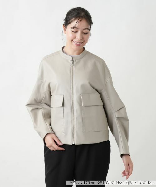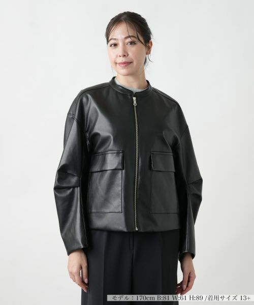 上品な艶感のある合成皮革を使用したシンプルながらも洗練されたデザインが魅力のジップアップブルゾン。ワーク感のあるフラップ付きの大きめポケットがアクセントになり、スタイリッシュな印象を演出します。ほどよくゆとりのあるシルエットが、抜け感のあるこなれた着こなしを叶えます。適度にボリュームを持たせたスリーブにタックをいれることで立体感のある表情に。ワンピースに羽織ってフェミニンに、デニムと合わせてカジュアルにと、幅広いスタイルで活躍するお洒落感のある一着です。