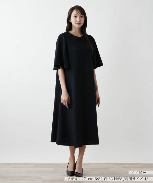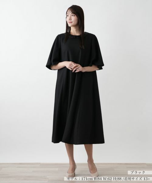 エレガントなデザインが魅力のブラックワンピース。繊細な装飾が施された襟元が上品なアクセントになり、洗練された印象を演出します。ふんわりと広がるフレアシルエットが美しいドレープを生み出し、女性らしさを引き立てるデザイン。動きのあるフレアスリーブが華やかさをプラスし、程よい抜け感を演出します。シンプルながらも存在感のある一枚で、フォーマルなシーンから特別な日のお出かけまで幅広く活躍します。※定価(税込)は、2025年6月27日のセール開始前の店舗における販売価格です。