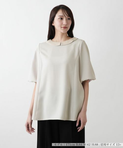 スパンコールが煌めくサークル形状の襟が個性を演出するバルーンスリーブブラウス。襟は取り外しでき、2wayでの着こなしが楽しめます。ゆったりとしたシルエットが心地よく、程よい抜け感をプラス。ふんわりとしたスリーブが華やかさを引き立て、動きのある表情を生み出します。バック中央に配したファスナーによりスムーズな着脱が可能。パンツを合わせてカジュアルに着こなすのはもちろん、ロングスカートとコーディネートすれば、フェミニンでエレガントな印象に。