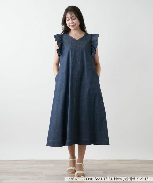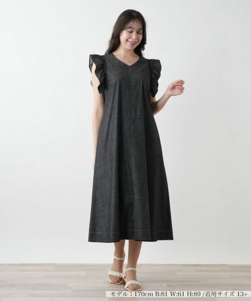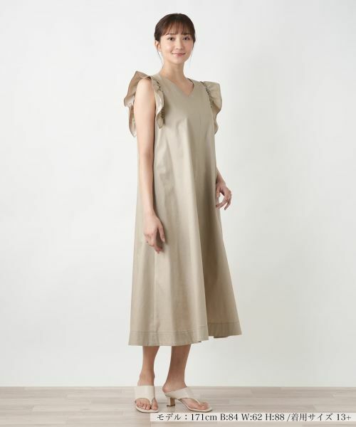 ふわりとしたフリルスリーブが華やかな印象を添えるワンピース。程よくボリュームを持たせたフリルが肩まわりを優しく包み込み、自然とスタイルアップ見せも叶えてくれます。胸元はシャープなVネック仕立てで、デコルテをすっきりと見せながら絶妙な抜け感を演出。身体のラインを拾いにくいゆとりのあるシルエットで、気になる部分をさりげなくカバーしてくれるのも嬉しいポイント。フラットサンダルでリラックス感のあるリゾートスタイルを楽しむのもおすすめです。バックファスナーにより着脱が可能。