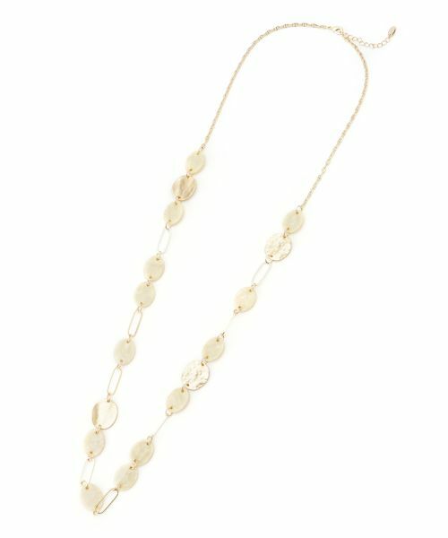 マーブルやメタルといった異なる質感のオーバルモチーフが、リズミカルにチェーンで連なるロングネックレス。異素材のコントラストが絶妙なバランスを生み出します。これからの季節のシンプルになりがちなスタイリングにさりげない個性と洒脱なエッセンスをプラスし、上級者らしいニュアンスのある表情を演出。縦長のラインがコーディネートをすっきりと見せ、遠目からでも存在感を放つ一本です。