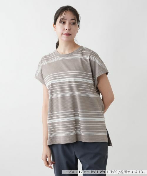 リズミカルなボーダーが目を惹くベスト。ネックラインは浅めに設定し、カジュアルながらも上品で落ち着いた印象に仕上げました。ショルダー部分を覆うようなゆったりとしたリラクシーなシルエットがこなれ感を演出。裾にはサイドスリットを入れて前後差を生み出しています。ストレートパンツと合わせてシックに、クロップドパンツやレギンスを合わせて軽やかに着こなすのもおすすめ。さらりとしたコットンベースの生地を使用した、ロングシーズン活躍する一枚です。
