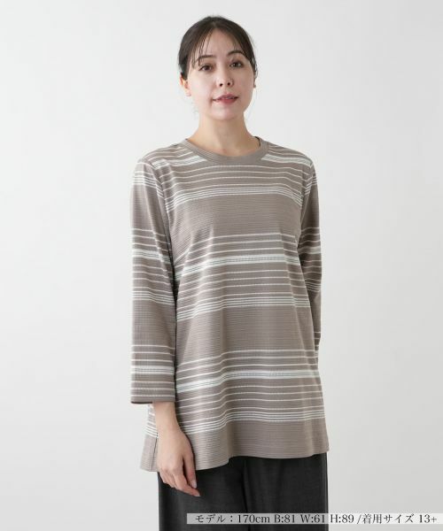 リズミカルなボーダーが目を惹くクルーネックカットソー。ネックラインは浅めに設定し、カジュアルながらも上品で落ち着いた印象に仕上げました。ヒップが隠れるほどの絶妙な丈感が、ナチュラルに体型をカバーしつつ、リラクシーなシルエットを演出。ストレートパンツと合わせてシックに、クロップドパンツやレギンスを合わせて軽やかに着こなすのもおすすめ。さらりとしたコットンベースの生地を使用した、ロングシーズン活躍する一枚です。