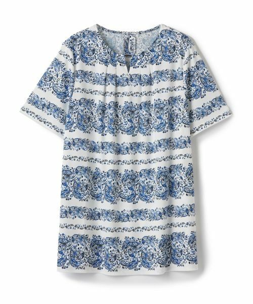 オリエンタルなペイズリー柄を全面にあしらったブラウス。細やかな模様がリズムよく並び、視線を惹きつける存在感を放ちます。メタルライクなバー付きのキーネックで仕上げ、デコルテにさりげない抜け感とアクセントをオン。緩やかに落ちるドレープシルエットが、動きに合わせてしなやかに揺れ、女性らしさをナチュラルに引き立ててます。一枚で印象的な着こなしが完成する主役級のトップスです。