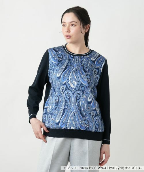 異素材で切り替えたフロントのペイズリー柄がインパクトを放つニットプルオーバー。絶妙なバランスで程よい華やかさとクラシカルなムードを引き立てます。袖と背面はシンプルに仕上げることで、柄の美しさをより引き立てています。浅めのクルーネックで、顔まわりをすっきりと見せながら上品な佇まいに。パンツと合わせたスマートな通勤スタイルから、スカートでまとめた女性らしい週末コーデまで多彩に楽しめる、大人のためのエレガントなニットです。