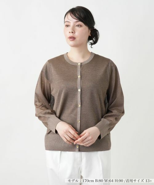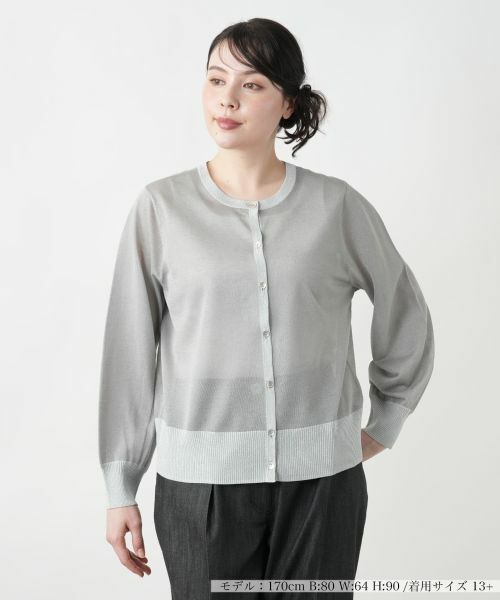 軽やかなシアー素材に上品なラメが施されたクルーネックニットカーディガン。ほんのり透け感のあるデザインが涼しげで、シーズンムードを高めます。程よい光沢感があり、カジュアルからきれいめコーデまで幅広く活躍。前を閉じてプルオーバー風に着ても、羽織りとしても使える便利な一枚です。柔らかく伸縮性のある素材で着心地も抜群。デニムやスカートと合わせたリラックススタイルから、ワンピースの上にさらりと羽織るスタイリングまで、さまざまな着こなしが楽しめます。