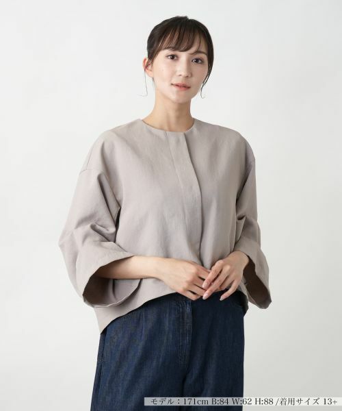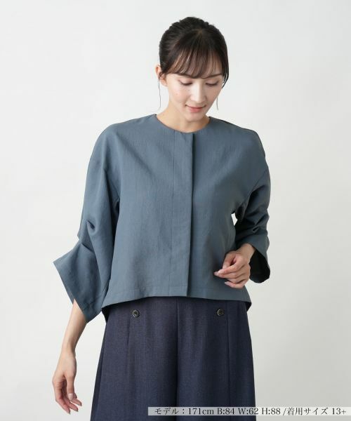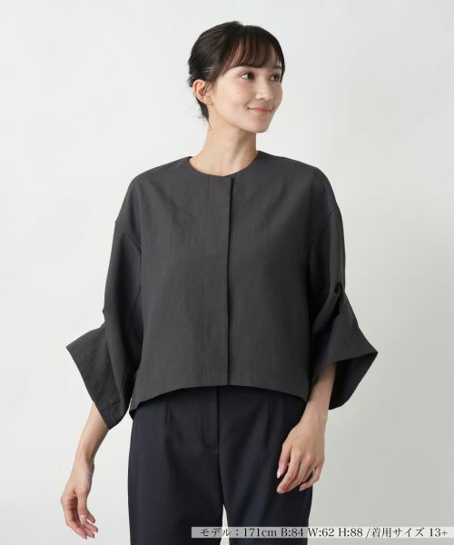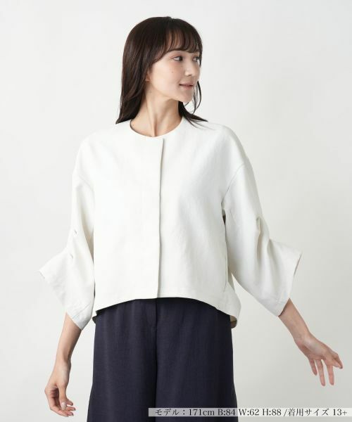 立体的なスリーブデザインが印象的な、モードな雰囲気漂うノーカラージャケット。前立ては比翼仕立てでミニマルに仕上げ、洗練された印象を引き立てます。フロントのスナップボタンで開閉が可能です。身幅にゆとりを持たせたボックスシルエットは、動きやすさとこなれ感を両立。残誤差のある程よい着丈で、パンツもスカートもバランス良く決まります。デザイン性がありながらも、合わせるアイテムを選ばず、オフィスから週末のお出かけスタイルまで幅広く活躍。1枚で着映えるジャケットです。