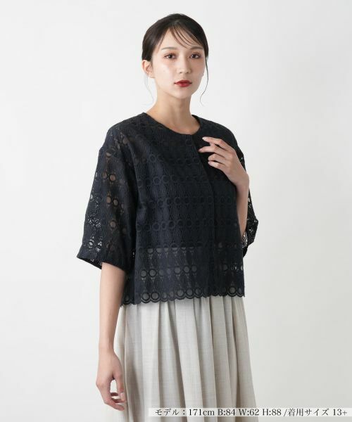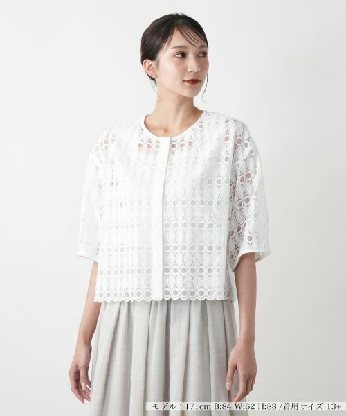表情豊かなアンティーク調レースを全体にあしらい、クラシカルでありながら今の空気感に寄り添うノーカラージャケット。フロントに配したスナップボタンがミニマルな美しさを引き立てます。コンパクトな丈感でバランスよく、ワンピースやワイドパンツとも好相性。さらりと羽織るだけで、コーディネートに上品な抜け感をプラスしてくれます。きれいめにもカジュアルにも映える、季節の端境期に活躍する軽やかな一着です。
