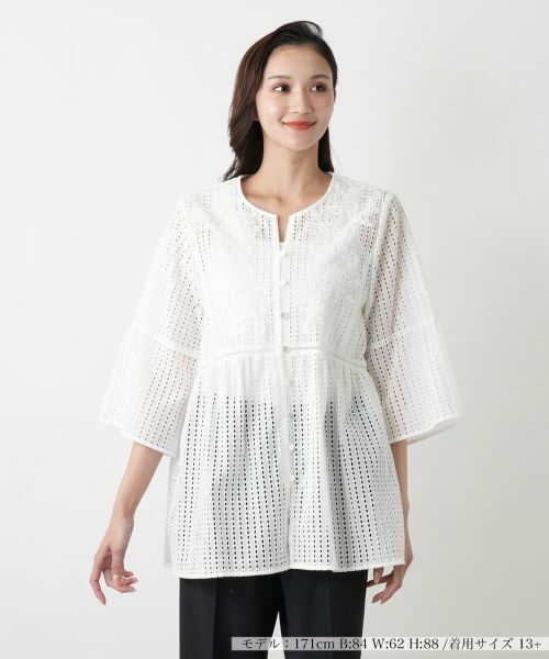 繊細なディテールが光る、涼やかな透かしレースのキーネックブラウス。通気性のある薄手のレース素材をベースに、前身頃の上部にはチュールと刺繍を重ねて、立体感のある表情をプラスしました。胸元はすっきりとしたキーネックに加え、ループボタンをあしらい、上品な抜け感を演出しています。ヒップまで隠れるチュニック丈で身体のラインを拾わず、ボトムスを選ばずに着まわしやすいトップスです。