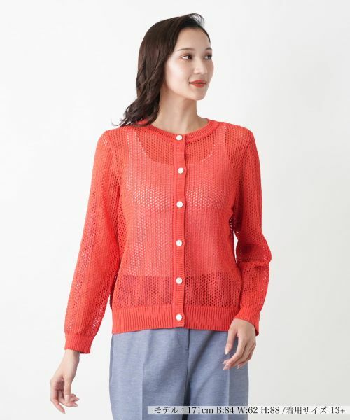 メッシュ編みで仕立てた涼しげな表情のカーディガンです。ほどよくゆとりをもたせたリラックス感のあるシルエットが、これからの季節らしい抜け感のあるスタイリングを演出。透け感のある編み地が軽やかで、お手持ちのインナーに重ねるだけで技ありのレイヤードスタイルが楽しめる一枚です。パンツ、スカートを選ばずフレキシブルにコーディネートでき、季節の変わり目や冷房対策にも重宝します。