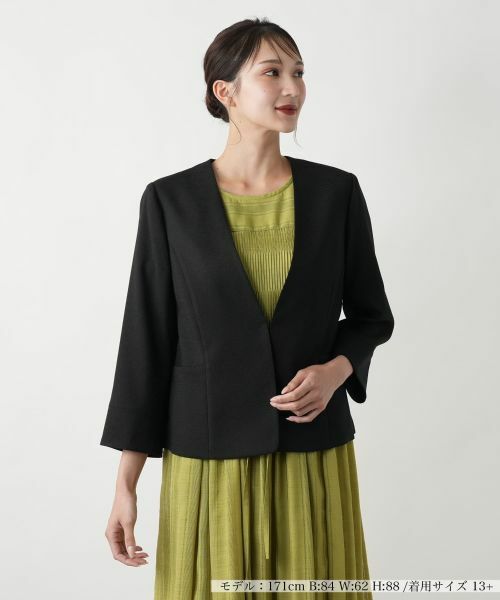 これからのシーズンに嬉しい薄手仕立てのノーカラージャケット。顔まわりをシャープに見せる深めのVネックがスマートな佇まいを演出。ストレッチ性のある生地を採用することで、動きやすさときちんと感を両立しました。ウエストにかけて自然にシェイプされたシルエットが、美しいバランスを描きます。フロントはホック仕様でミニマルに仕上げ、ワンピースやスカートとのフォーマルなスタイリングにもマッチする一着です。